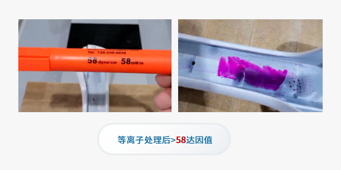 汽車門把手的外框與內壁在粘接前,可以使用等離子清洗機對產品表面進行活化處理,提高潤濕性,從而提高粘接強度。由此可見,通過等離子清洗機處理后的汽車門把手達因值達到58。