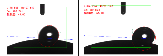 車(chē)載攝像頭要求避免水滴聚集,需要克服水珠聚集而導(dǎo)致全景攝像頭取景模糊的缺陷,因此對(duì)于攝像頭滾動(dòng)角的要求非常高。傾斜型接觸角測(cè)量?jī)x可有效的測(cè)量材料表面滾動(dòng)角,有效表征產(chǎn)品表面前進(jìn)后退角,可以評(píng)判產(chǎn)品表面疏水性能。