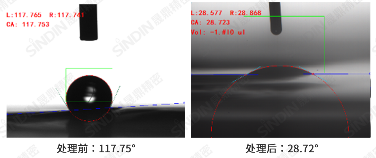 由上圖可見:等離子處理后,隔膜的水滴角降低至28.72°,其表面親水性得到提高,有效改善隔膜與電解液的相容性,從而提高電池的導(dǎo)電性和充放電性能。