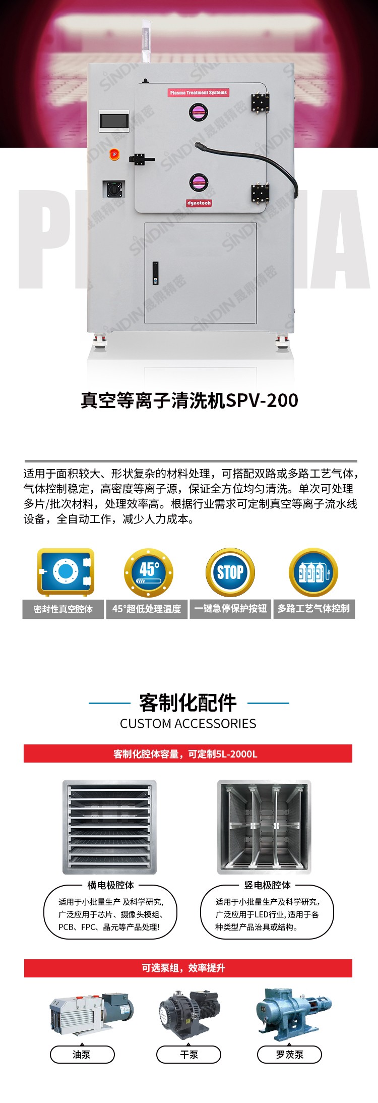 SPV-200 真空等離子清洗機(Plasma cleaner),氣體通過激勵電源離化成等離子態(tài),等離子體作用于產(chǎn)品表面,清洗產(chǎn)品表面污染物,提高表面活性,增強附著性能。等離子清洗是一種新型的、環(huán)保、高效、穩(wěn)定的表面處理方式。